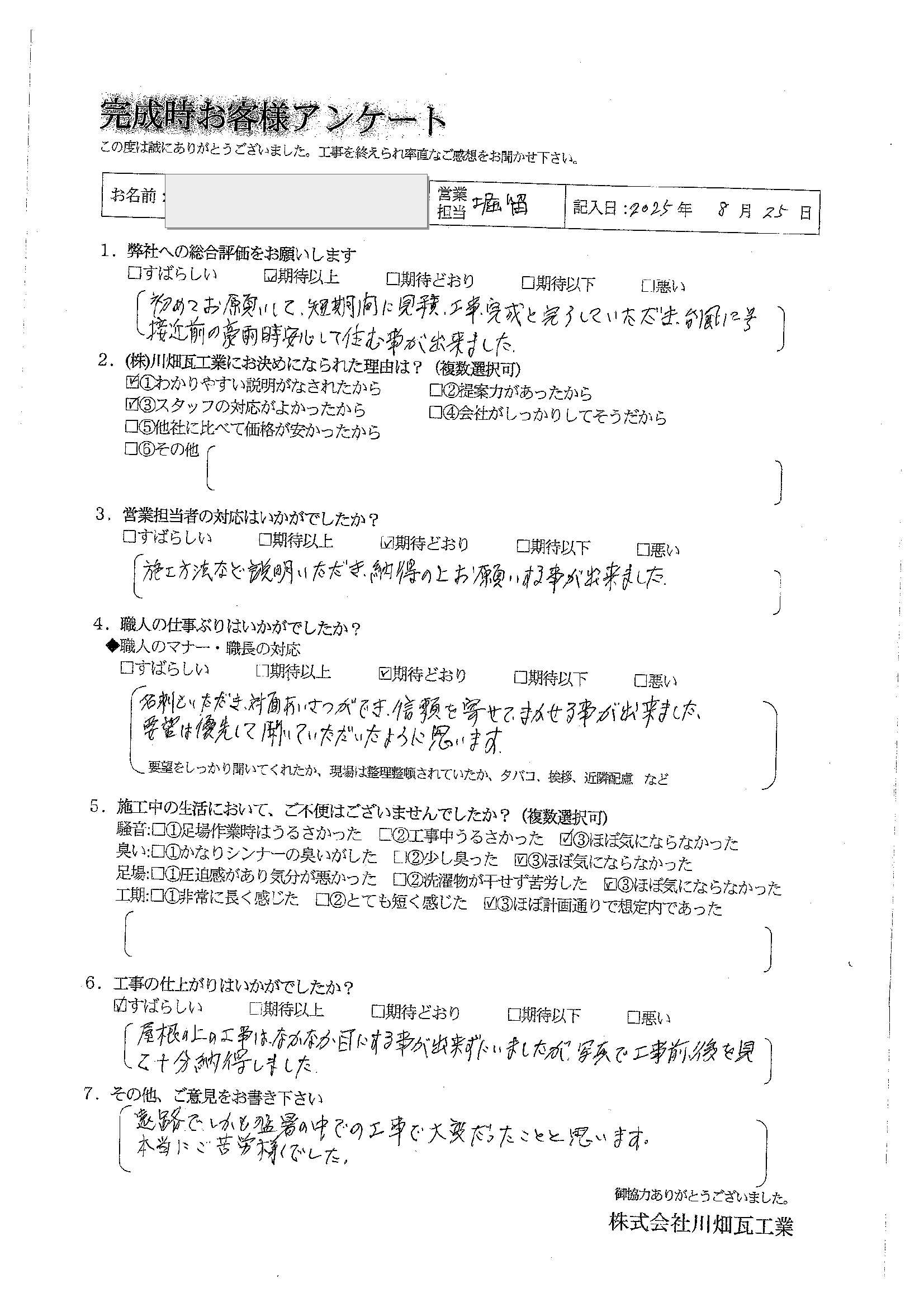 初めてお願いして短期間に見積、工事、完成と完了していただき、台風12号接近前の豪雨時安心して住む事が出来ました。