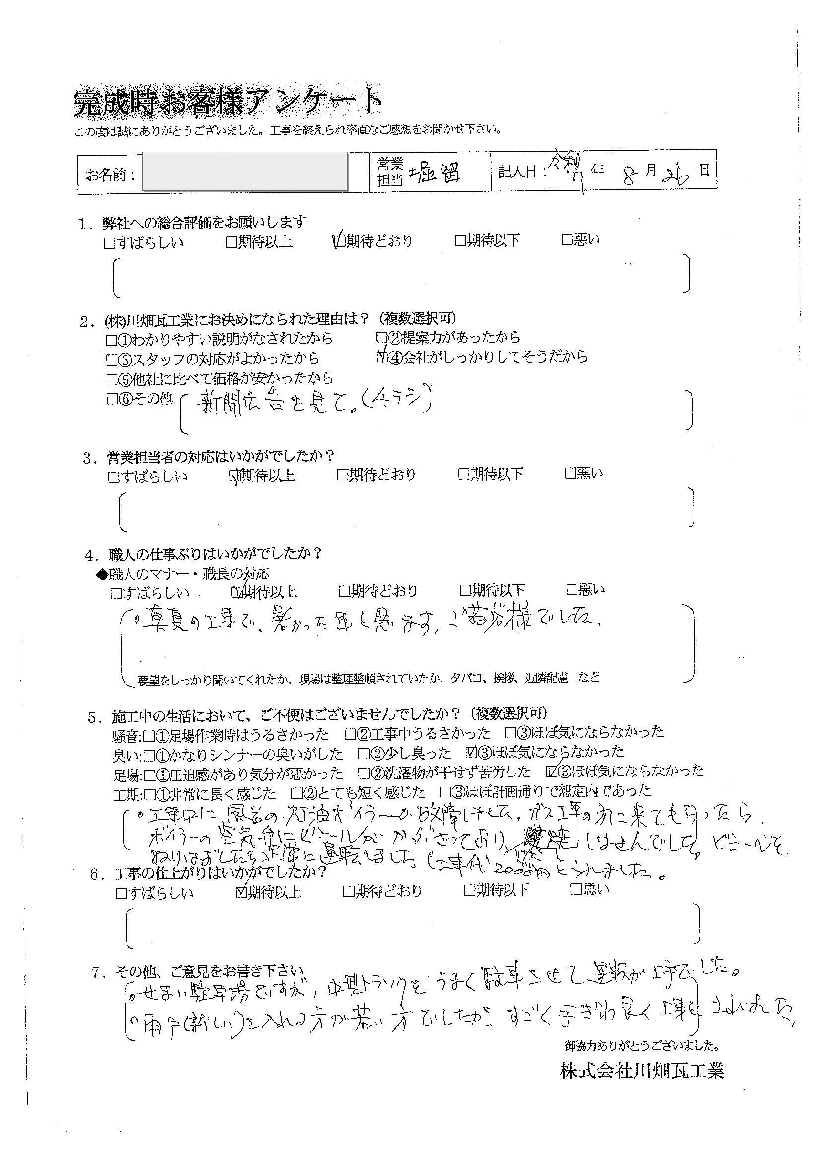 ・この度は工事ご依頼誠にありがとうございました。工事中、ご迷惑をお掛けして申し訳ありませんでした。今後、改善に努めてまいります。
